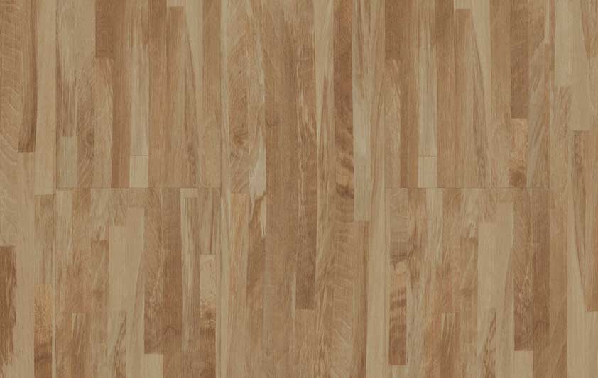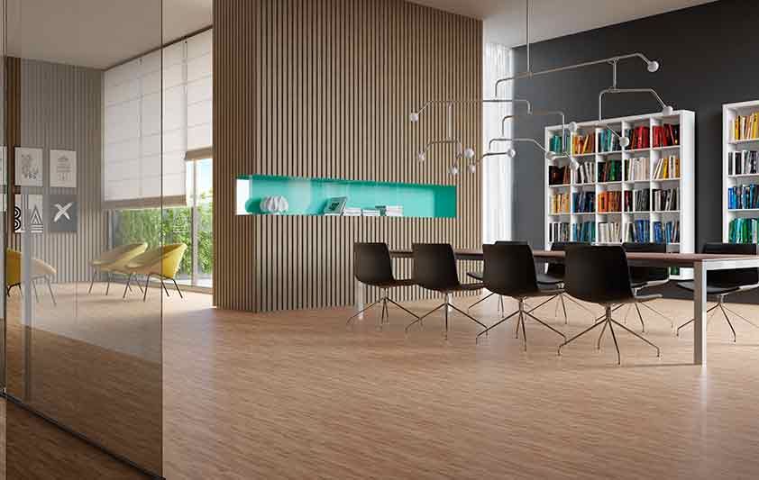 Piso vinílico que explora a elegância das réguas finas de madeira em tonalidade castanho claro e textura suave da madeira linheira, que realça ainda mais a coloração do padrão.